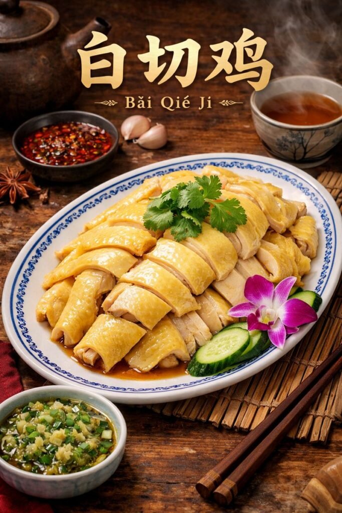 白切鸡 (White Cut Chicken) is a classic Chinese dish known for its simplicity and natural flavors. Made by gently poaching a whole chicken and serving it with a fragrant ginger and scallion sauce, this dish highlights tender meat and smooth, glossy skin without heavy seasoning. It is a timeless comfort food commonly enjoyed in homes and traditional eateries.