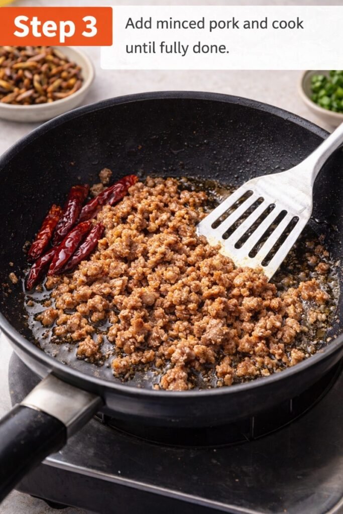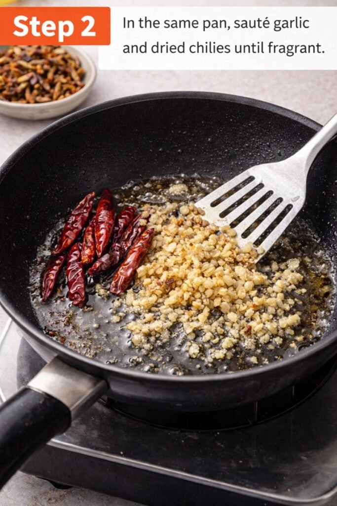 Step 2: In the same pan, sauté garlic and dried chilies until fragrant.