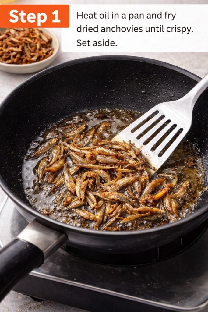 Step 1: Heat oil in a pan and fry dried anchovies until crispy. Set aside.