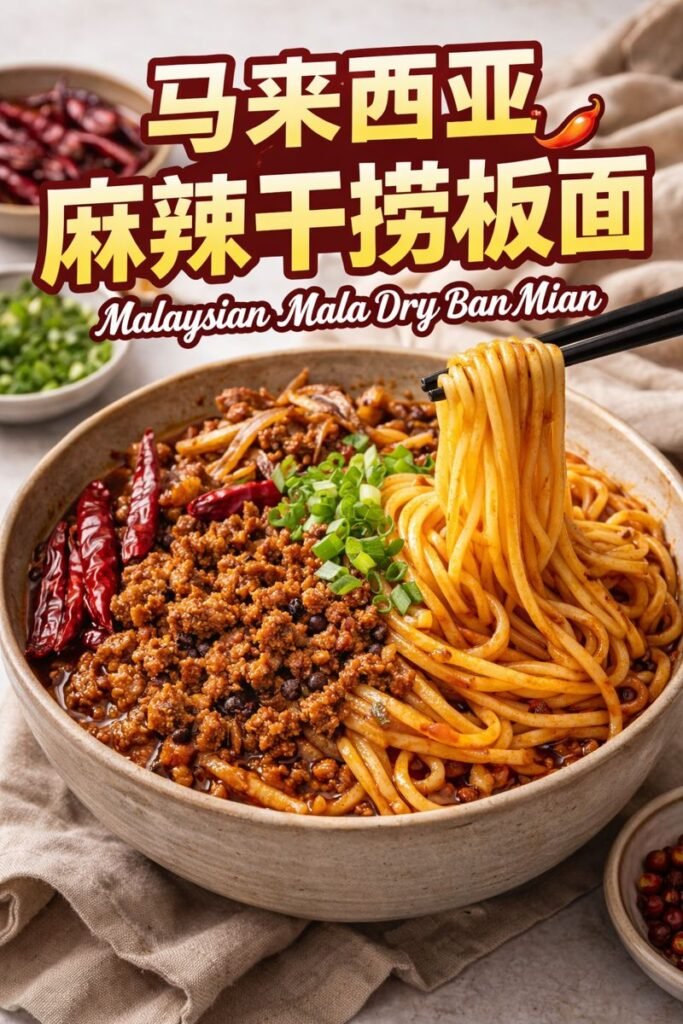 Malaysian Mala Dry Ban Mian is a spicy noodle dish inspired by Sichuan mala flavors.