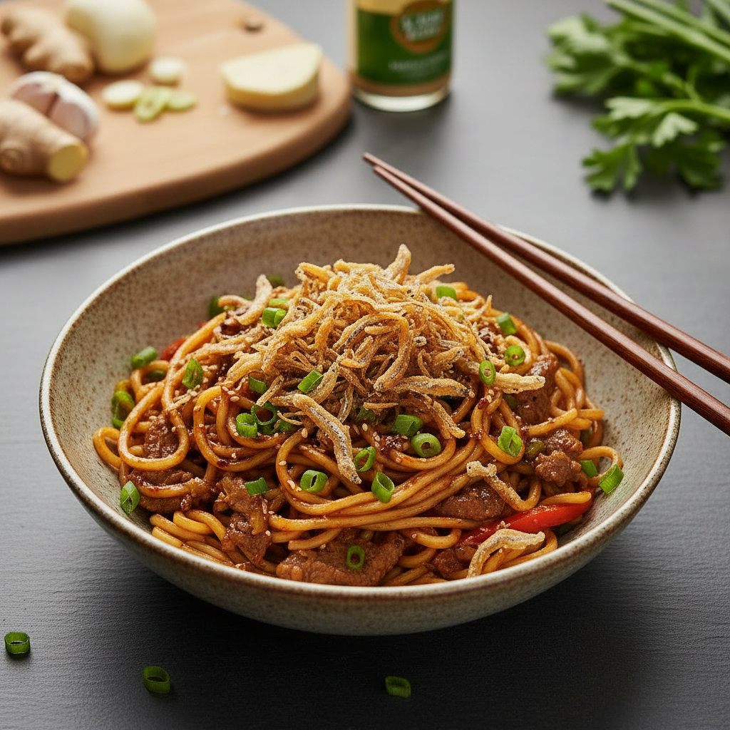 It is served dry with fragrant chili oil, minced pork, crispy anchovies, and handmade noodles.