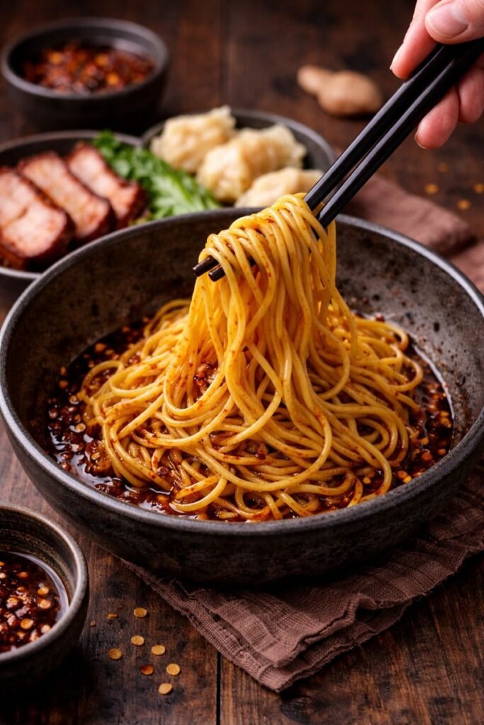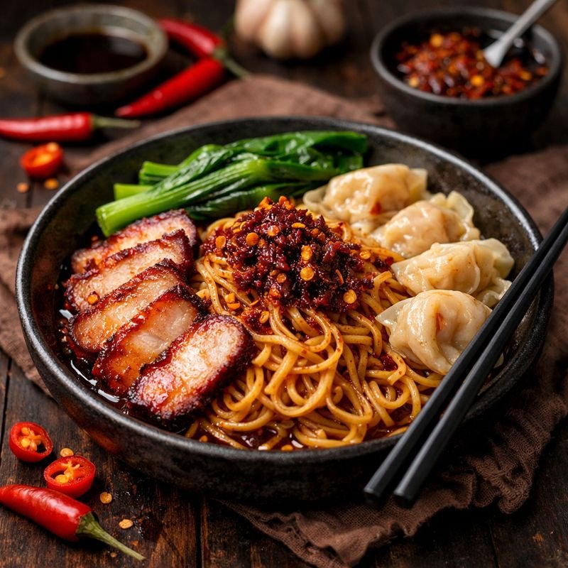 This Malaysian-style dry wantan mee is packed with springy egg noodles, savory char siu, and a fiery homemade chili oil. No soup, no rules — just bold flavors and adjustable spice levels for true chili lovers 🌶️🔥