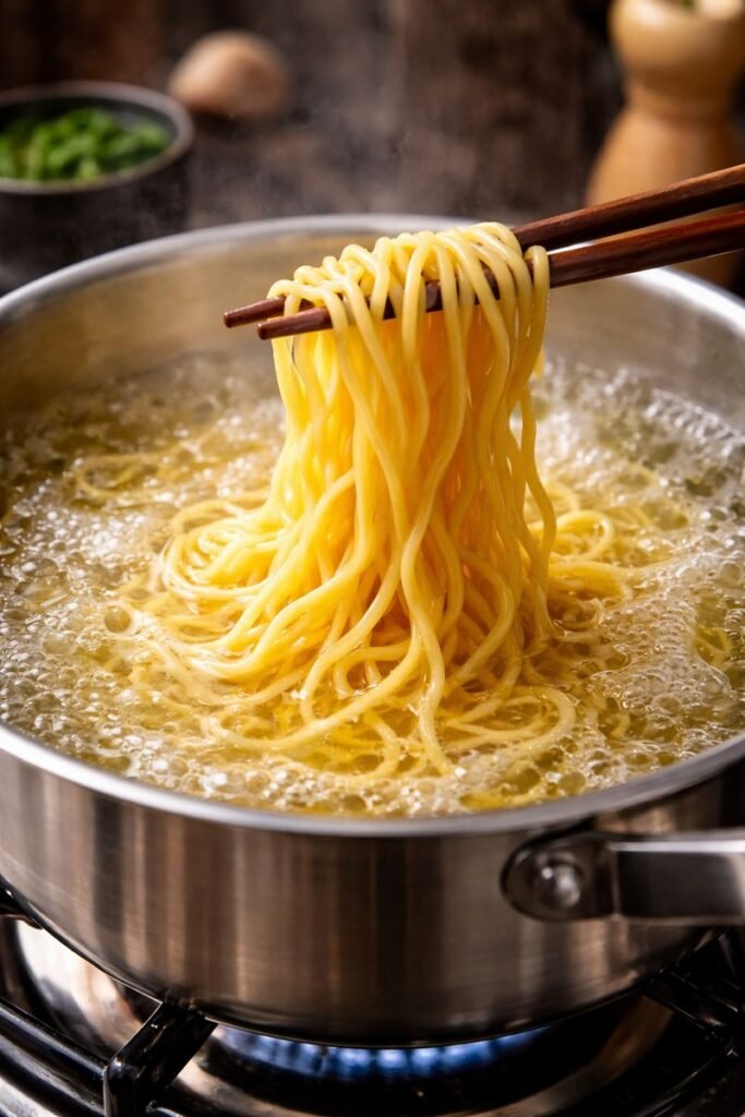 Cook egg noodles in boiling water until springy, about 1–2 minutes. Drain well and toss with a little oil to prevent sticking.