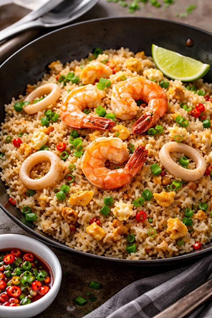 This seafood fried rice is light, fragrant, and packed with juicy prawns, tender squid, and fluffy rice grains that never clump. It uses simple ingredients but restaurant techniques to bring out wok aroma and natural seafood sweetness. Perfect for home cooks who want real hawker-style results.