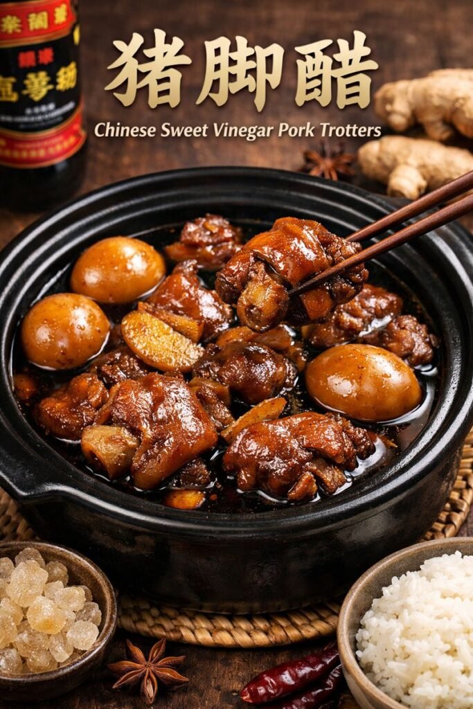 猪脚醋, also known as Chinese Sweet Vinegar Pork Trotters, is a traditional Chinese dish popular in Malaysia and Singapore. It is slow-cooked with old ginger, sweet black vinegar, and hard-boiled eggs, creating a rich, tangy, and slightly sweet broth.